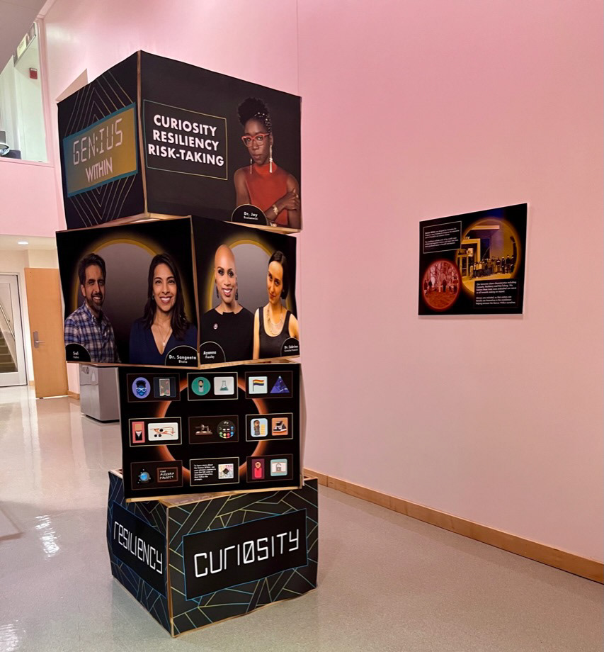 To embody inclusivity, the installation combines interactive elements like rotating cubes and mirrors, with digital storytelling via QR-linked content. My design strategy prioritized approachability: moving away from cold, technical aesthetics towards a more vibrant, human-centered palette and fun, futuristic typography. Every element was designed with accessibility in mind, from the height and angle of interaction to the ways people could meaningfully engage with the installation.